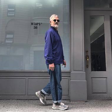 ▲ Vernon 也比較喜歡素色的單品,不管暗色或是亮色系他都樂於挑戰,例如大家衣櫥裡少見的紫色夾克他就擁有一件!美製 New Balance 993 簡單配上牛仔長褲並稍微反摺褲管,就能避免寬鬆版型帶來的休閒感!(圖片來源)